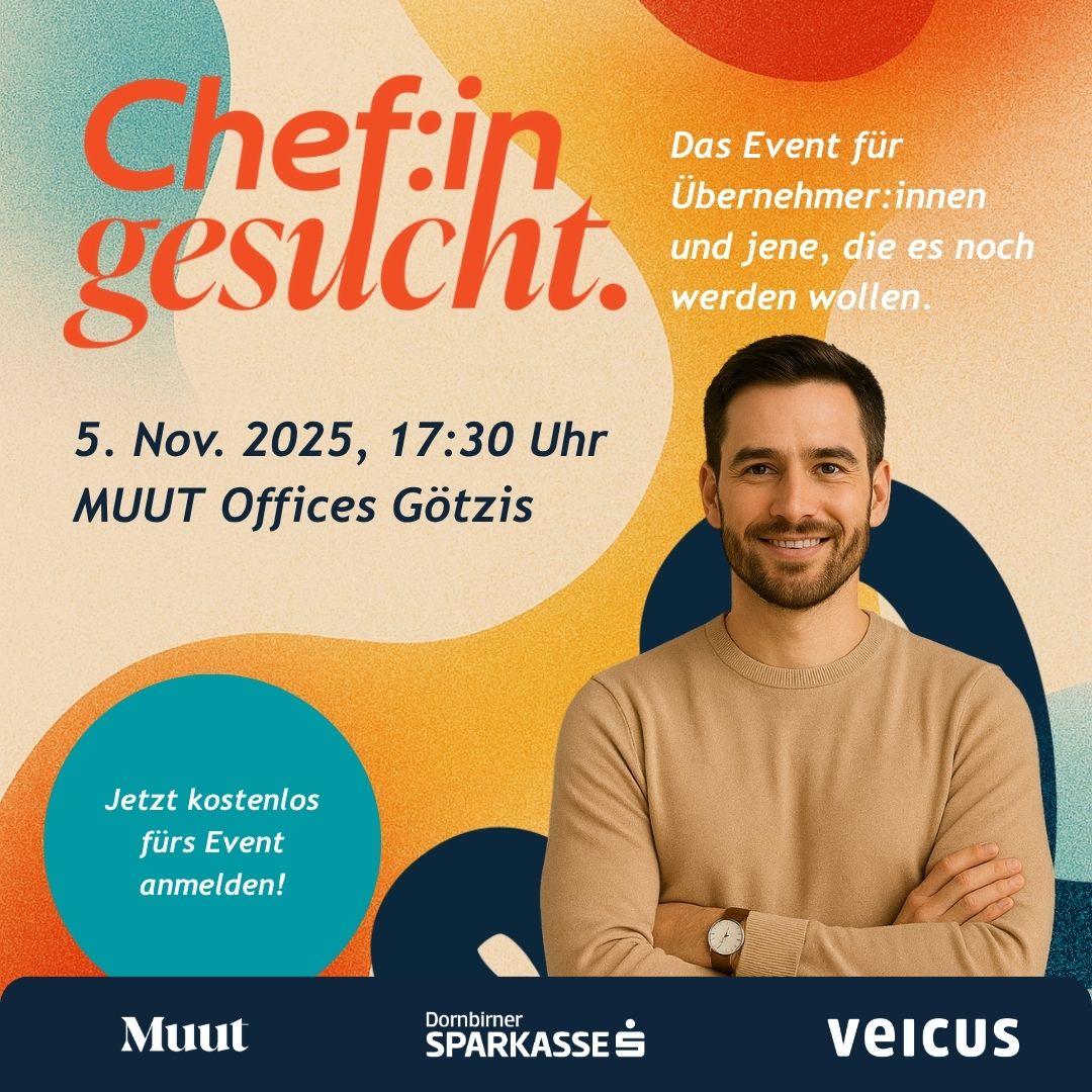 Die Dornbirner Sparkasse, MUUT Offices & veicus Unternehmensentwicklung gestalten einen Abend voller Impulse, Beratung, Kontakte & Raum für deine Nachfolge.